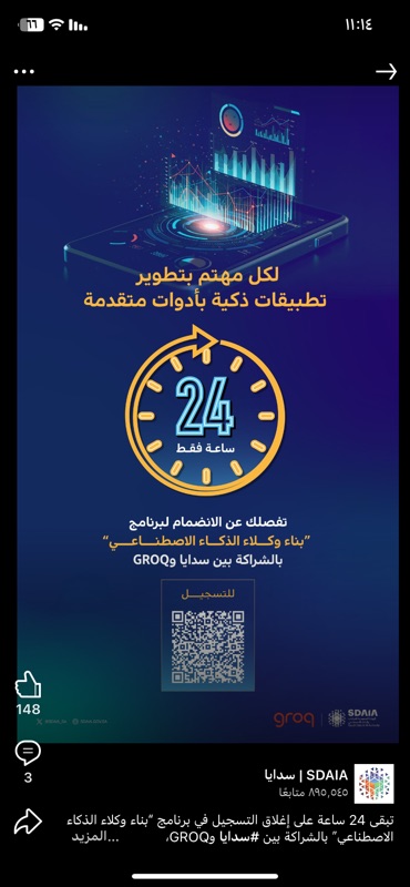 تبقى 24 ساعة على إغلاق التسجيل في برنامج “بناء وكلاء الذكاء الاصطناعي” بالشراكة بين #سدايا وGROQ، لتطوير مهاراتك في تصميم وتطوير تطبيقات ذكاء اصطناعي