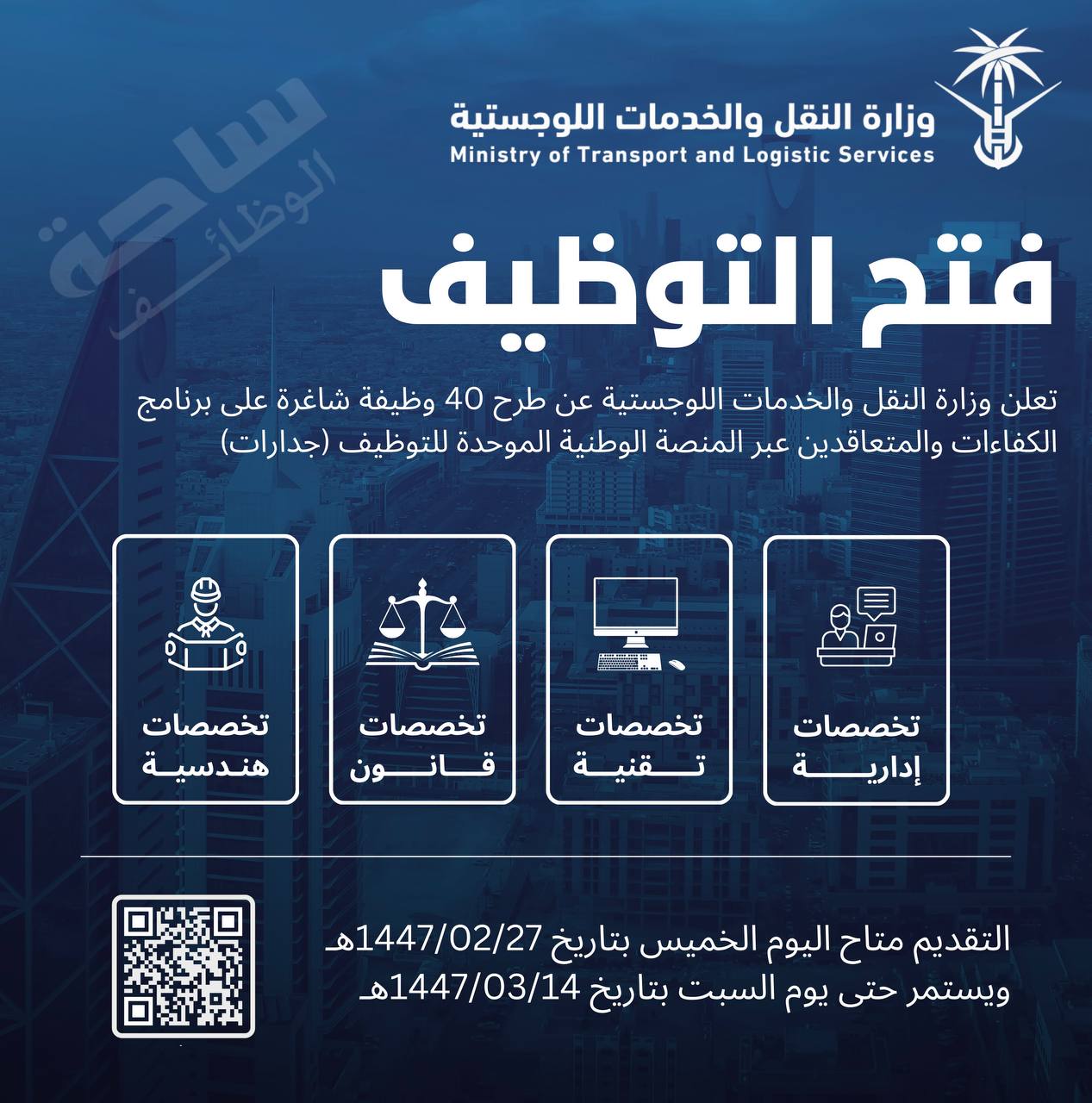 🔥 وزارة النقل والخدمات اللوجستية تعلن ٤٠ وظيفة شاغرة على برنامج الكفاءات والمتعاقدين.